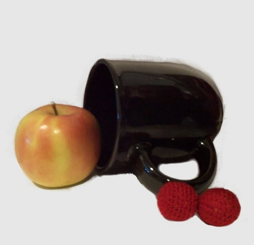 Large Chop Cup Coffee Mug: 4″ tall, Mouth is 3 1/2″. Produce a large load from this chop mug. Porcelain. Comes with a set of knitted chop cup balls, and directions.