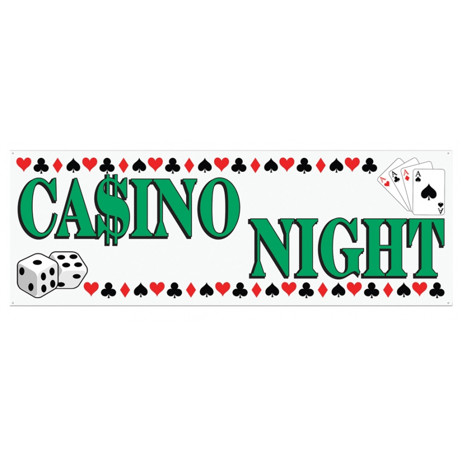 CASINO NIGHT BANNER 5FT X 21IN. The perfect banner for civic events! Banner features cards and dice shown with the words “Casino Night” in green and bordered by the different suits of a deck of cards. The item measures 5′ x 21″.
