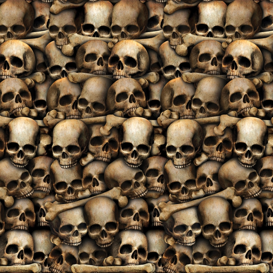 CATACOMBS BACKDROP. This spooky catacombs backdrop is great for photo-ops or simply decoration at your halloween party or haunt. Includes photo print of a spooky scene with piles of skulls that seem to be watching. Made of PEVA. 4ft x 30ft. Attach to walls as desired. Indoor/Outdoor use.