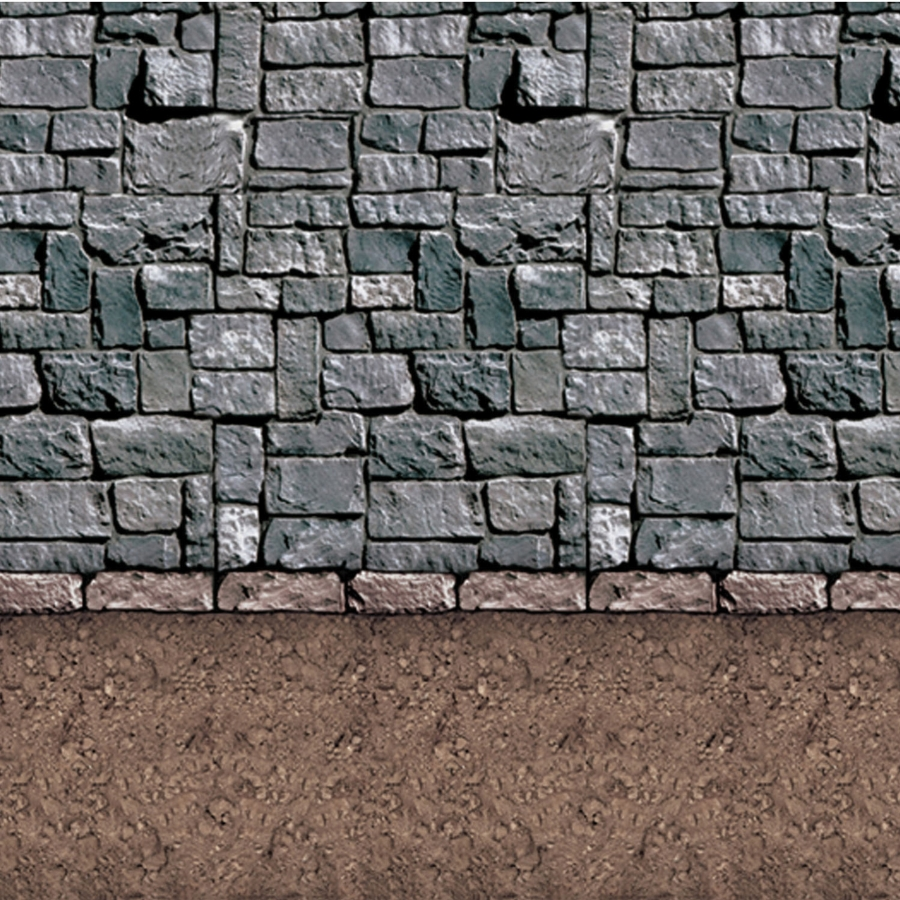 DIRT FLOOR BACKDROP. This 30 ft long wall mural depicts a stone wall and dirt-floor backdrop. Great for photo-ops or simply decoration at your halloween party or haunt. Made of PEVA. Add props and borders to your wall mural. Attach to walls as desired. Indoor/Outdoor use. 4ft x 30ft.