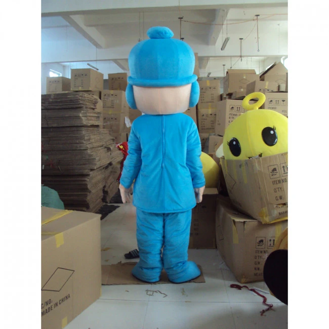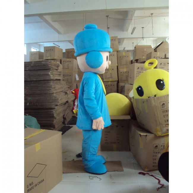 Giant Pocoyo Mascot Costume. Pocoyo is the main character of the Pocoyo series. He is a young human child that tends to be childish, understand things minimally and tends to throw a tantrum or storms away in a hurry. Pocoyo is also very innocent and learns something new everyday. Here we have Giant Pocoyo with his big black eyes, blue three-flap hat, blue jacket with a yellow zipper, blue pants and blue shoes. Look like your favorite Pocoyo character to stand out of the crowd looking adorable as ever.