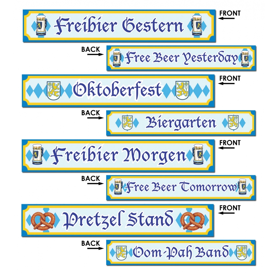 OKTOBERFEST SIGN CUTOUTS. Great signs for your Oktoberfest celebration! Comes with 4 signs, each with a different saying on the front and back for a total of 8 designs, 2 for each sign. Paperboard. 4in x 24in.