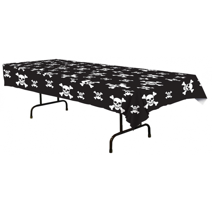 PIRATE TABLE COVER 54 X 108. A great table cover for a pirate party or a child’s birthday White skulls and crossbones on a black field. Item measures 54″ x 108″.