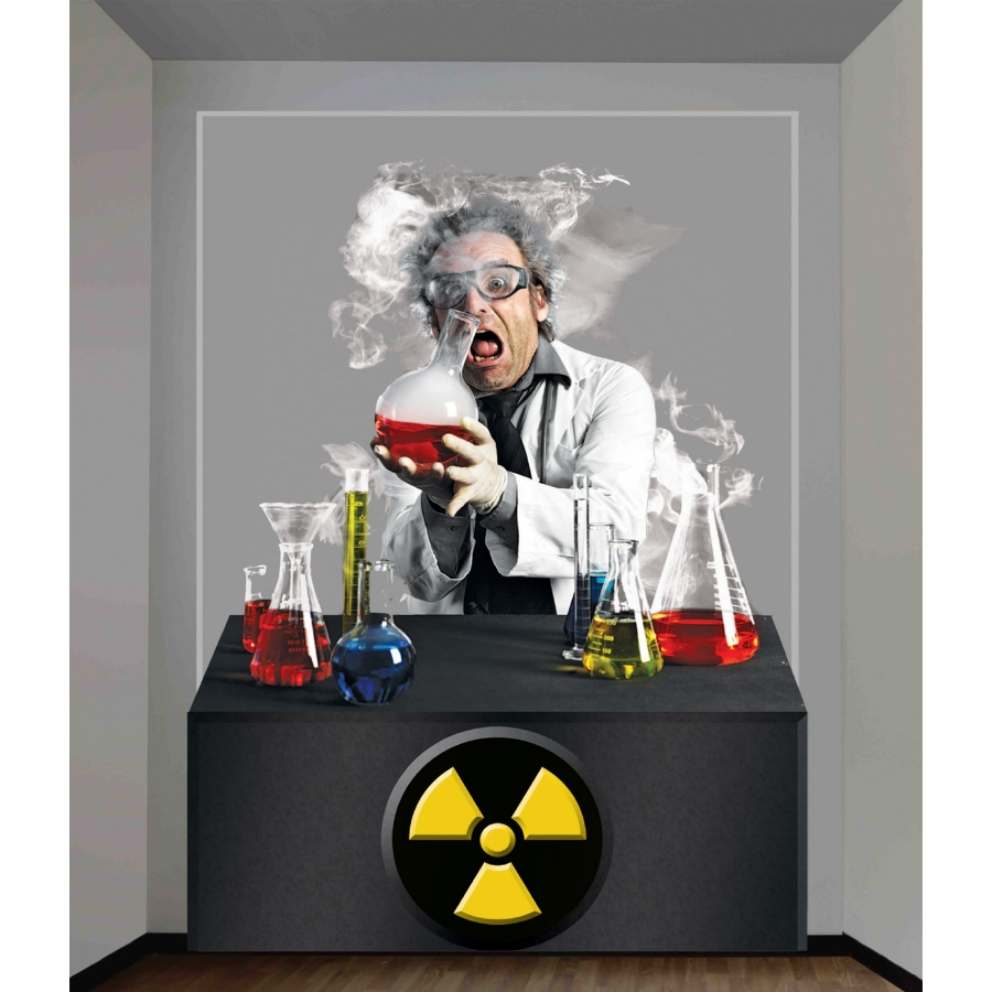 SCIENTIST WALL DECORATION 4X5. A great wall decoration for your haunted house. Shows scientist at his work desk being overcome by the noxious chemicals with which he is working. 4′ x 5.3′.