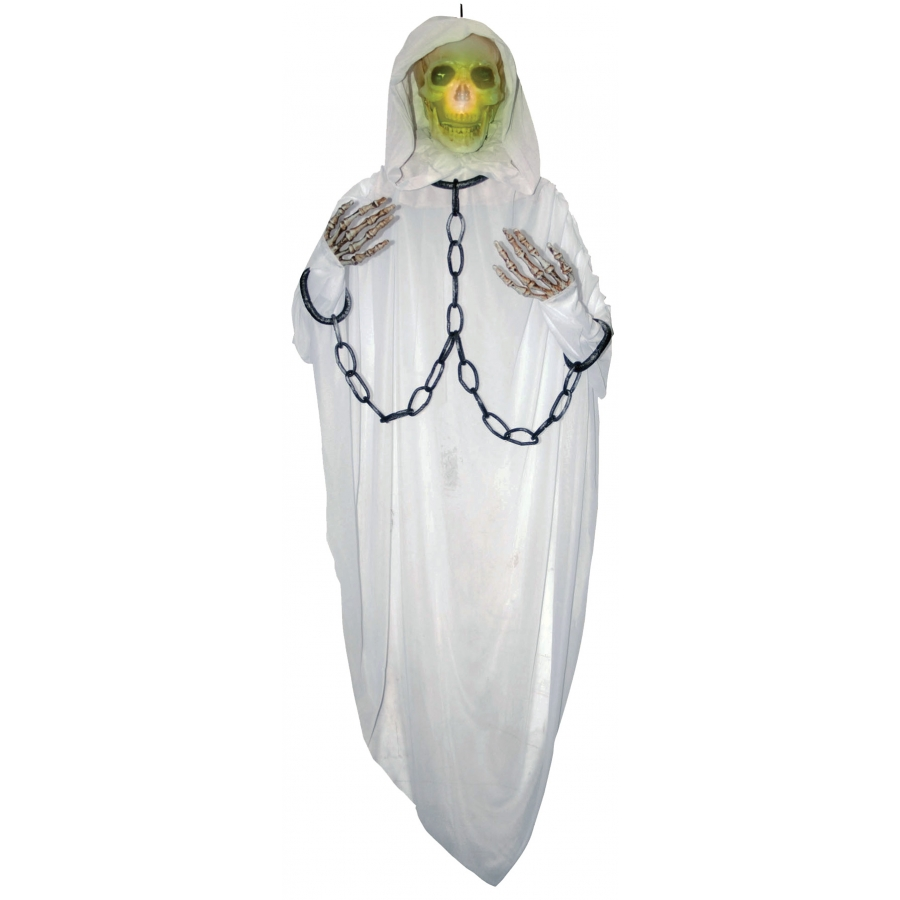WHITE REAPER LIGHTUP CHAINED. 5 foot skeleton with light-up color changing skull and chained possible arms. Requires 3 AG13 watch batteries. (Not included)